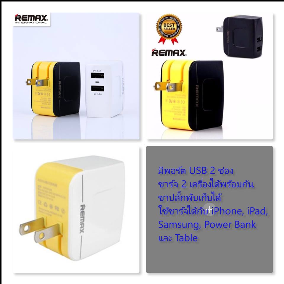 รายละเอียดสินค้า - อะแดปเตอร์ Adapter จากผู้ผลิตอุปกรณ์Smart Phone ยี่ห้อ Remax จากฮ่องกง มาตรฐานส่งออกทั่วโลก Adapter คุณภาพดีเพิ่มความคงทน ทนทาน วัสดุภายในคุณภาพสูง เพื่อเพิ่มประสิทธิภาพในการชาร์จ - มีพอร์ต USB 2 ช่อง สามารถชาร์จอุปกรณ์ได้ 2 เครื่องพร้อมกัน ไม่กินพื้นที่ปลั๊ก - พอร์ต USB ช่องแรก จ่ายไฟแรงถึง 2.4A สำหรับชาร์จ Tablet, Smart Phone รุ่นใหญ่ และ Power bank ความจุสูงๆ ได้เร็วยิ่งขึ้น - พอร์ต USB ช่องที่สอง จ่ายไฟปกติขนาด 1A สำหรับชาร์จโทรศัพท์มือถือและอุปกรณ์ทั่วไป - ดีไซน์ใหม่ รูปทรงทันสมัย ขนาดกะทัดรัด - ขาปลั๊กแบบพับเก็บได้ พกพาสะดวก ไม่เปลืองพื้นที่ ขณะเดินทาง - LED Charging Indicator มีไฟ LED สีฟ้า แสดงสถานะ ขณะใช้งาน - ระบบตัดไฟอัตโนมัติเมื่อรีชาร์จไฟเต็ม